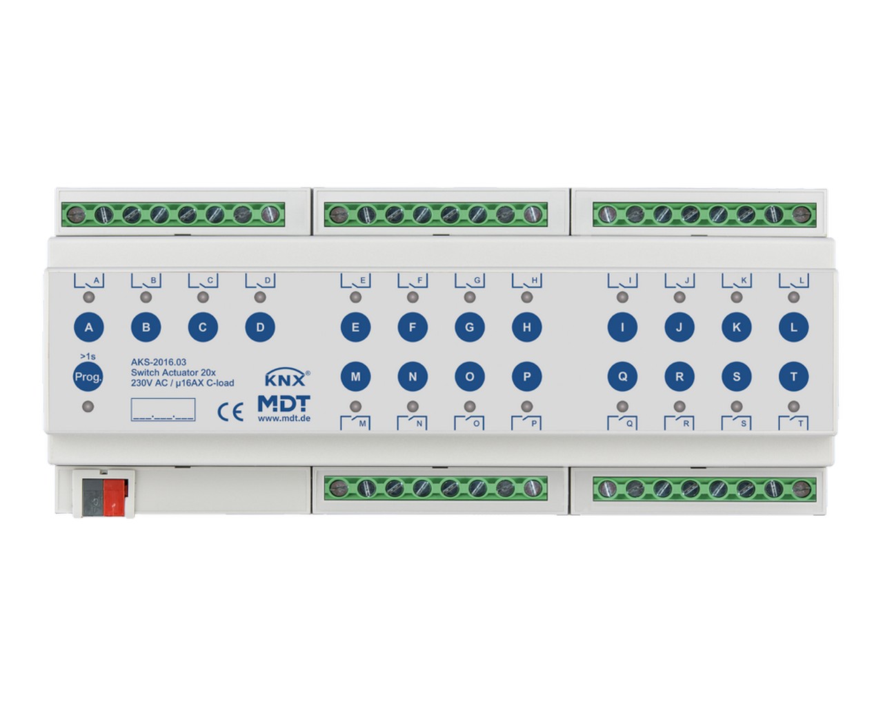 MDT AKS-2016.03 Schaltaktor 20-fach, 12TE, REG, 16A, 230VAC, C-Last, Standard, 140µF