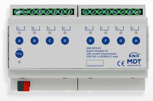 MDT AMI-0816.03 Schaltaktor 8-fach, 8TE REG, 16/20 A, 230 V AC, C-Last mit Strommessung, C-Last mit Strommessung