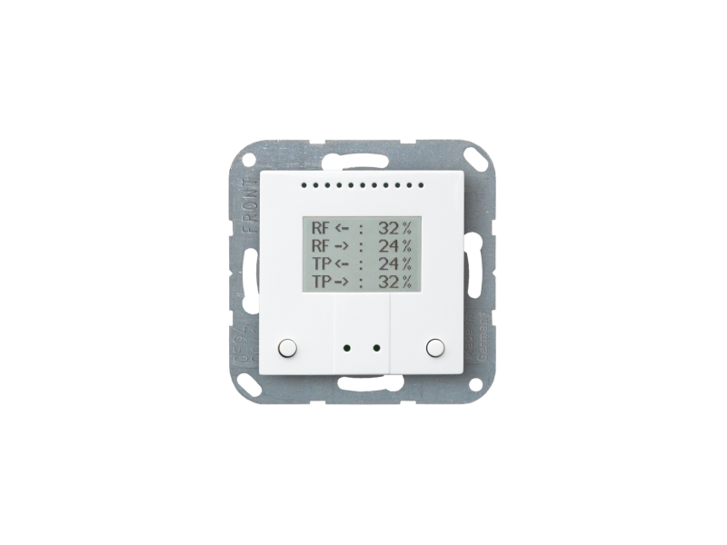 Der KNX RF LC-TP zeigt auf mehreren Displayseiten Adressierung und Traffic und Telegrammfluss an. Das Gehäuse wird mit einem Rahmen der im Gebäude verwendeten Schalterreihe ergänzt und passt sich so nahtlos in die Innenausstattung ein.