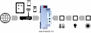 Das KNX IP BAOS 773 ist eine universelle Schnittstelle für den KNX Installations-Bus. BAOS steht für „Bus Access und Object Server“. Kommunikation zum KNX ist sowohl auf Telegrammebene (KNXnet/IP Tunneling) als auch auf Datenpunktebene (KNX Application Layer) möglich. Clients können über ein binäres Protokoll (TCP/IP oder UDP/IP) oder über JSON (Java Script Object Notation) Web Services direkt auf Gruppenobjekte zugreifen.