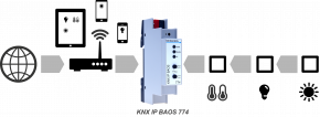 Das KNX IP BAOS 774 ist eine universelle Schnittstelle für den KNX Installations-Bus. BAOS steht für „Bus Access und Object Server“. Kommunikation zum KNX ist sowohl auf Telegrammebene (KNXnet/IP Tunneling) als auch auf Datenpunktebene (KNX Application Layer) möglich. Clients können über ein binäres Protokoll (TCP/IP oder UDP/IP) oder über JSON (Java Script Object Notation) Web Services direkt auf Gruppenobjekte zugreifen.