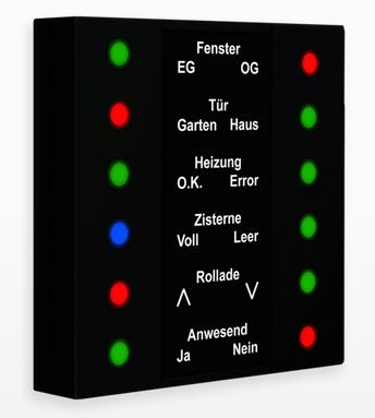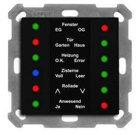 Die MDT LED Anzeige 55 mit ihren 12 LED ist ideal zum Visualisieren von Statusmeldungen aller Art. Es können drei Zustände angezeigt werden (rot, grün, blau), beispielsweise zur Visualisierung des Fensterstatus: zu / gekippt / offen. Integrierte Logiken ermöglichen unter anderem das Zusammenfassen mehrerer Fensterkontakte.