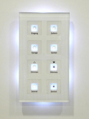 Der MDT Glastaster verfügt über ein umlaufendes Orientierungslicht und je eine zweifarbige (Weiß/Rot) LED pro Sensorfläche. Diese können mit internen oder externen Objekten angesteuert werden und sind in 5 Helligkeitsstufen (Tag und Nacht unabhängig voneinander) einstellbar. Es besteht die Möglichkeit 3 Zustände mit einer LED anzuzeigen z.B.: LED aus = „abwesend“, LED weiß = „anwesend“, LED rot = „Fenster auf“.