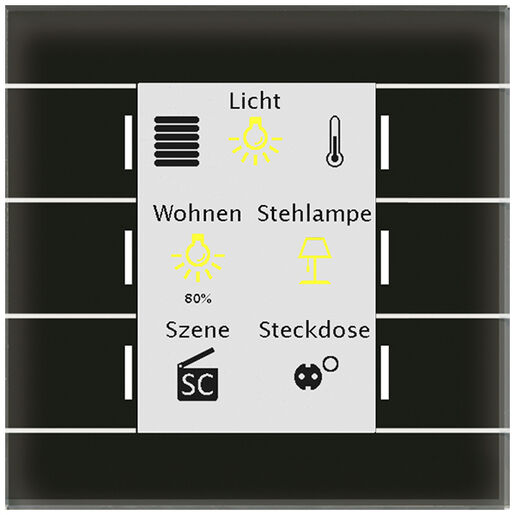 Glastaster II Smart mit Farbdisplay und Temperatursensor, Schwarz. Ausführung mit 6 Sensorflächen, Farbdisplay und RGB Statusanzeige. Verwendbar als 4/6/8/12-fach Taster. Integrierter Busankoppler.