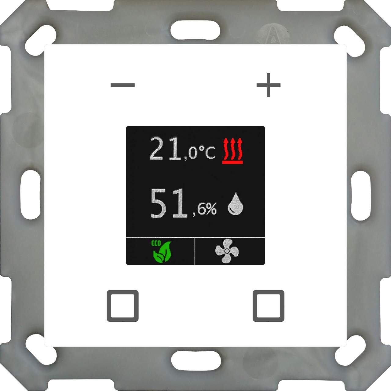 Raumtemperaturregler Smart 55, Reinweiß glänzend. Mit Farbdisplay, Temperatur-/Feuchtesensor und 4 Eingängen. Montage in Schalterdose. Integrierter Busankoppler. Passend für 55mm Schalterprogramme