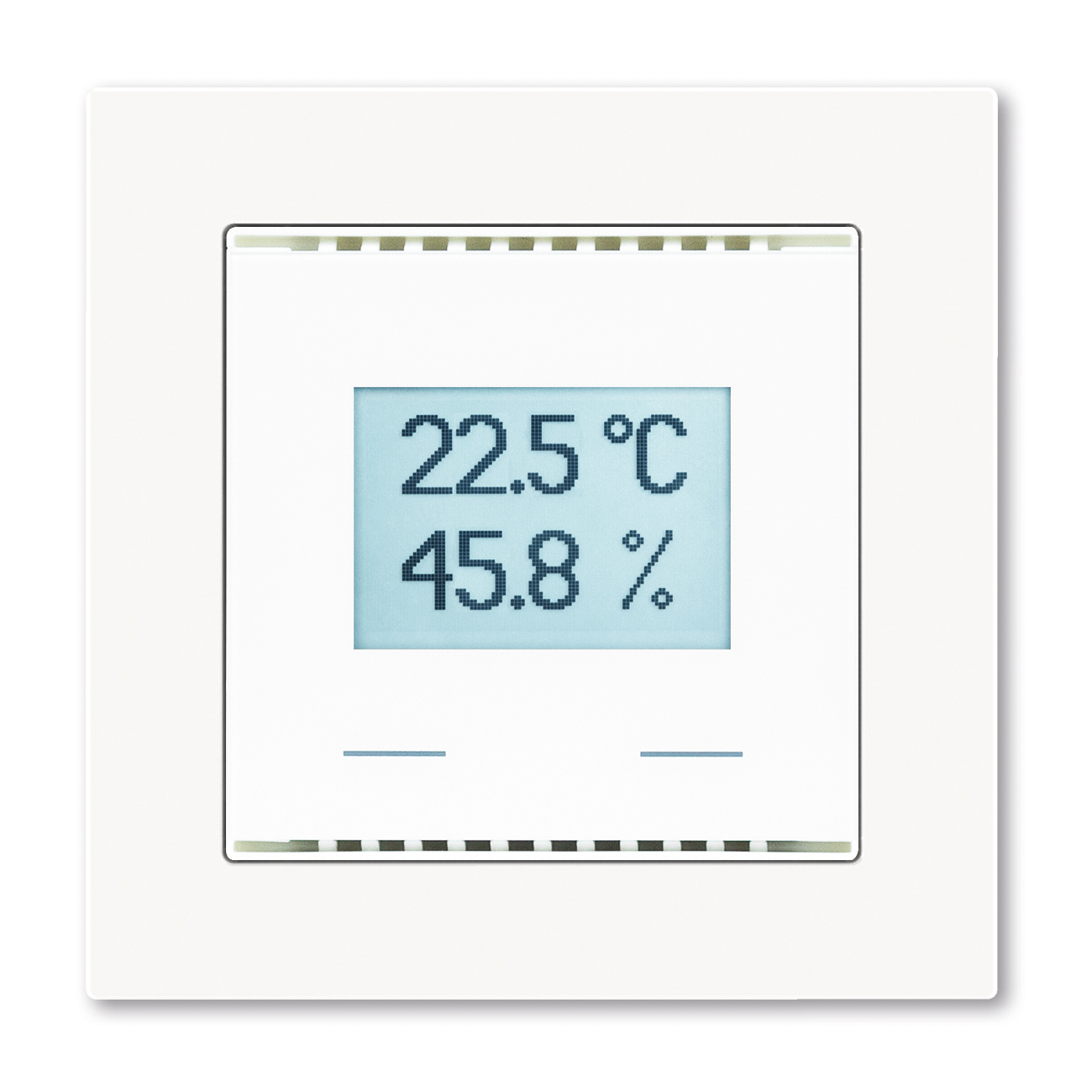 Das integrierte Display zeigt die eigenen Werte und über den Bus empfangene Daten (z. B. Datum, Uhrzeit). Das Gehäuse wird mit einem Rahmen der im Gebäude verwendeten Schalterreihe ergänzt und passt sich so nahtlos in die Innenausstattung ein.