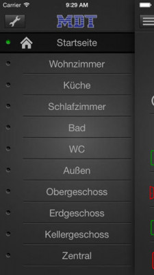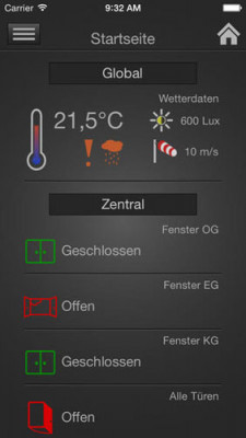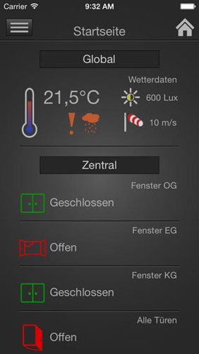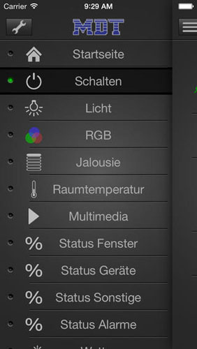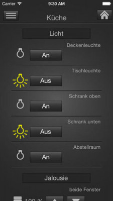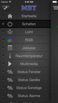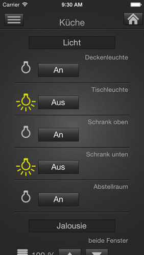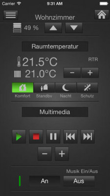 - Visualisierung und Bedienung von Beleuchtung, Jalousie, Raumtemperatur, Status, Mediadaten, Wetterdaten.
